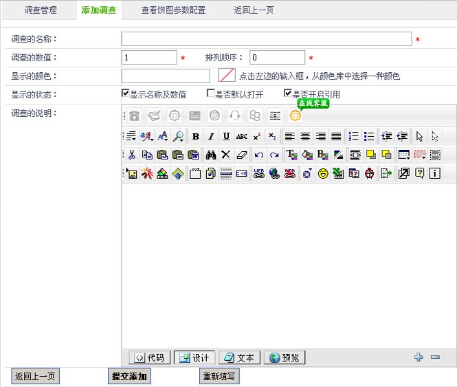 1.在“调查的名称”字段,填写调查的名称名称。2.在“调查的数值”字段,填写调查的名称数值。3.在“显示的颜色”字段,填写显示调查的颜色值。4.在“显示的状态”字段,设置显示的状态(显示名称及数值、是否默认打开、是否开启引用)。5.在“调查的说明”字段,填写在线调查详细说明。