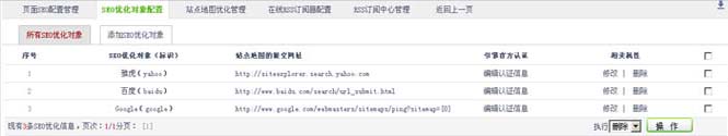 对SEO优化对象进行,添加、对站点地图的提交网址、引擎官方认证信息修改与删除操作,以便在3.4.3章节中配置的网站地址提交至搜索引擎。